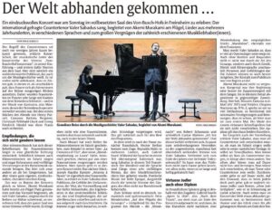 Zu diesem außergewöhnlichen Liederabend mit dem Countertenor Valer Sabadus und der Pianistin Akemi Murakawi hat Frau Kirsch von der Rheinpfalz einen sehr schönen und umfangreichen Bericht geschrieben, der am 11.11. veröffentlicht wurde.